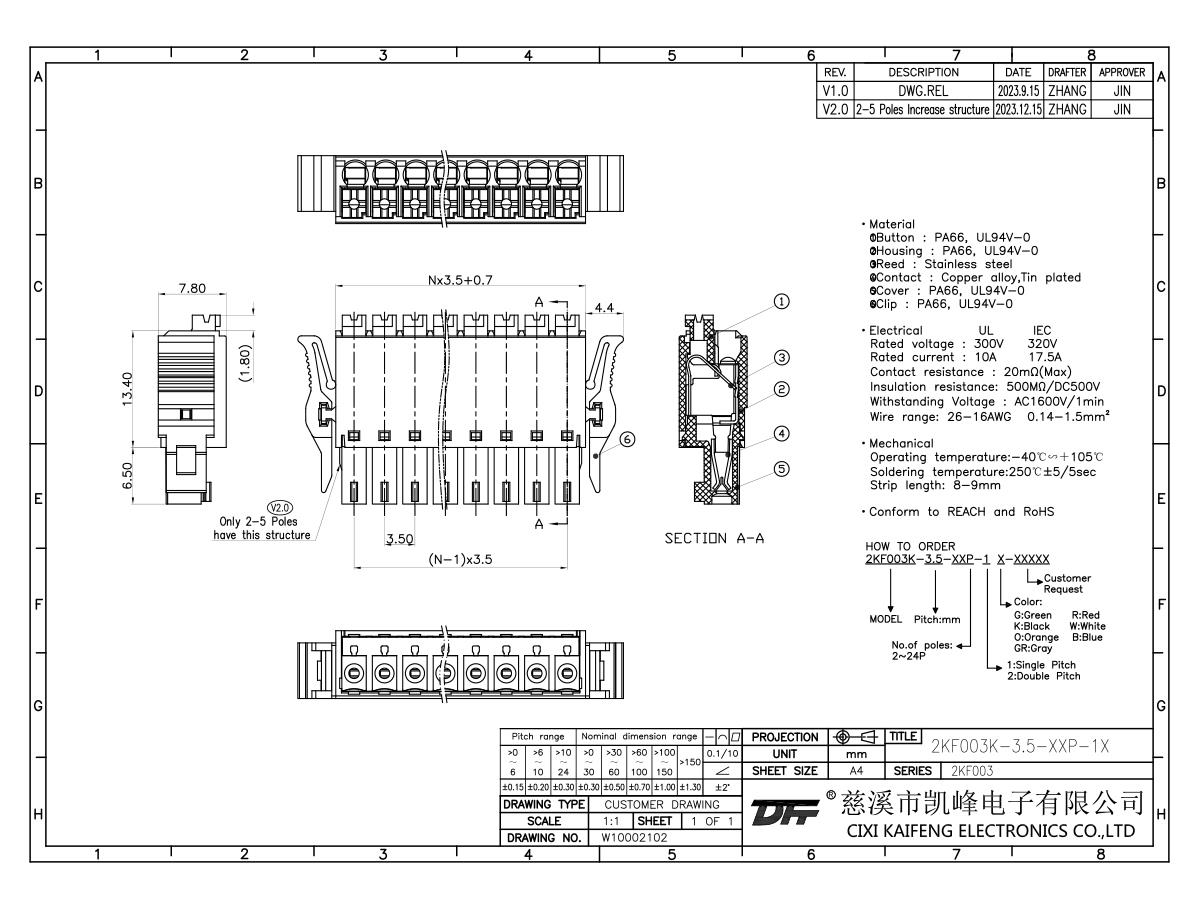 Pluggable Terminal Block MATERIAL:①Reed:PA66,UL94V-0 ②Clip : Stainless steel3 Button:Phosphor bronzeElectricalUL IEC Rated voltage300V 320V &
