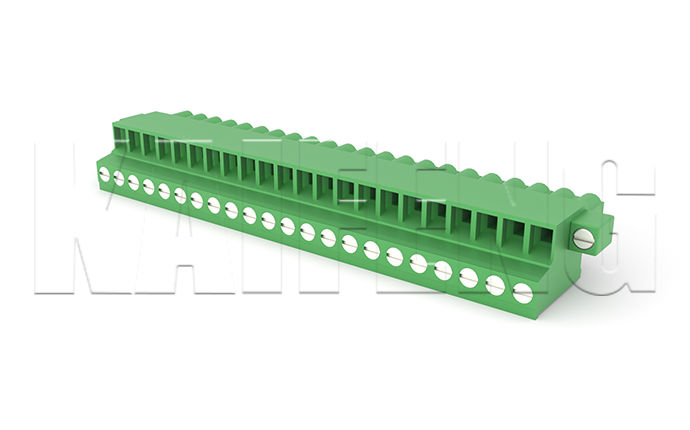Pluggable Terminal Block MATERIAL:MATERIALScrews: M2.5,Steel Zinc platedcontact: Phosphor bronzePin header: -Housing: PA66,UL94V-0ElectricalULIECRated voltage300V 320V/400VRated current15A20AContact resistance20mΩInsulation resistance500MΩ/DC500VWithstanding voltage AC2000V/1minWire range28-14AWG 2.5mm2MechanicalTemp.rang-40℃~+105℃ Max.soldering+250℃, 5se
