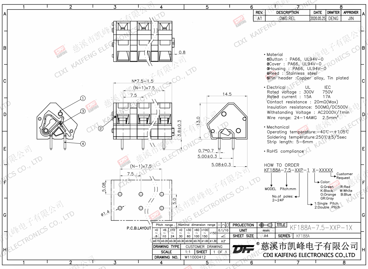 Terminal Material:①Button:PA66,UL94V-0②Cover:PA66,UL94V-0③Reed:Stainless steel④Pin header:Brass,Tin platedElectricalULIECRated voltage300V 750VRated current15A17AContact resistance20mΩInsulation resistance500MΩ/DC500VWithstanding voltage AC2000V/1minWire range24-14AWG 2.5mm2MechanlicalTemp.rang-40℃~+105℃ Max.soldering+250℃,5secTorque