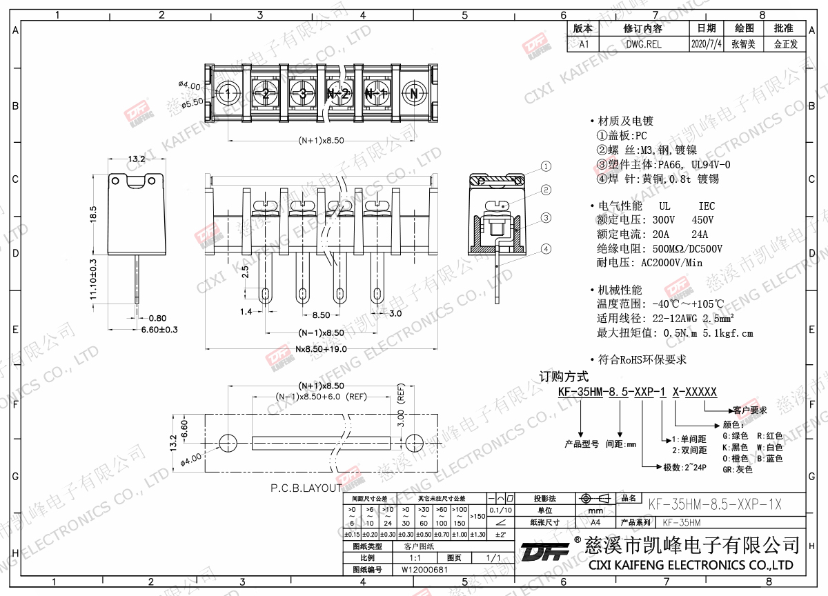 柵欄式接線端子 材質(zhì)電鍍:M3.0 鋼,鍍鎳端子:黃銅,0.8t 鍍鎳塑件: PA66,UL94V-0電氣性能ULIEC額定電壓300V 450V 額定電流20A24A絕緣電阻500MΩ/DC500V耐電壓AC2000V/1min使用線徑22-12AWG 2.5mm2機械性能溫度范圍-40℃~+105℃ 扭矩0.5N.m 4.4Lb.in