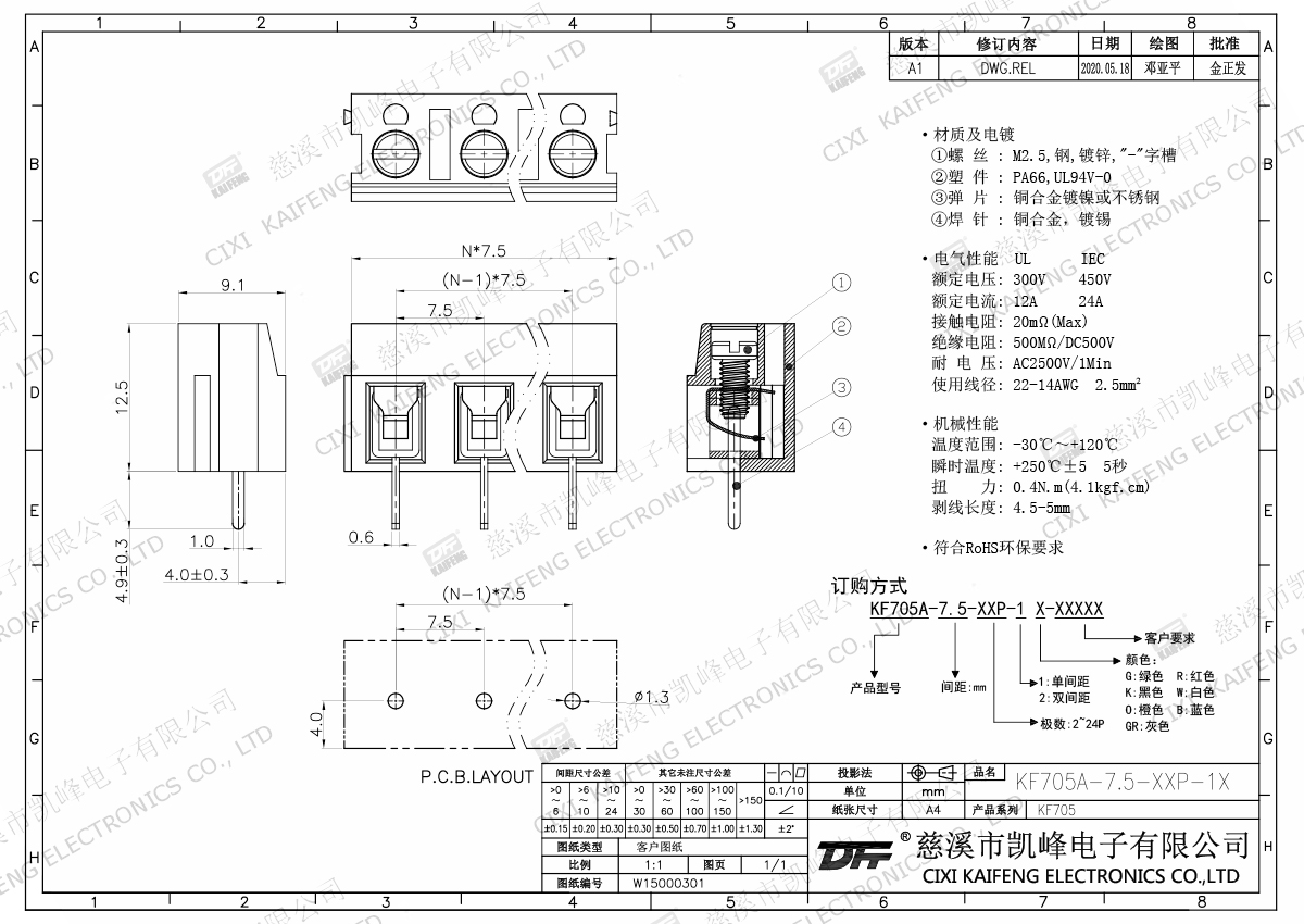 螺絲:M2.5 鋼,鍍鋅,"-"字槽 丨 觸點(diǎn):- 丨 焊針:銅合金,鍍錫 丨 塑件:PA66, UL94V- 0 丨 電氣性能:ULIEC 丨 額定電壓:300V-450V 丨 額定電流:12A-24A 丨 接觸電阻:20m?(Max) 丨 絕緣電阻:500MΩ/DC500V 丨 耐電壓:AC2500V/1min 丨 使用線徑:22-14AWG 2.5mm2 丨 機(jī)械性能溫度范圍:-30℃~+120℃ 丨 瞬時(shí)溫度:+250℃,5sec