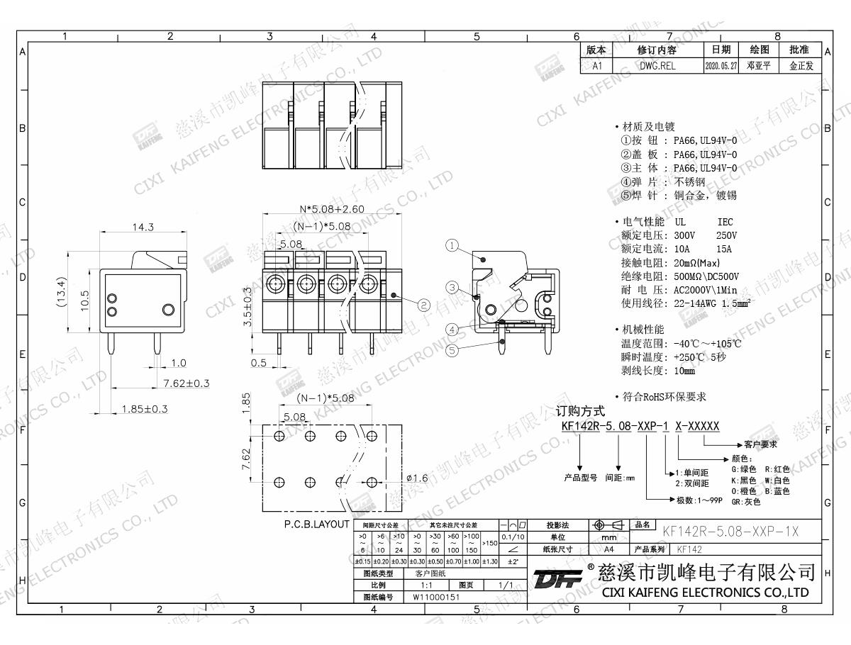 材質(zhì)電鍍:①按鈕:PA66,UL94V-0②蓋板:PA66,UL94V-0③主體:PA66,UL94V-0④彈片:不銹鋼⑤焊針:黃銅,鍍錫電氣性能ULIEC額定電壓300V 250V 額定電流10A15A接觸電阻20mΩ絕緣電阻500MΩ/DC500V耐電壓AC2000V/1min使用線徑22-14AWG 1.5mm2機(jī)械性能溫度范圍-40℃~+105℃ 瞬時溫度+250℃,5sec