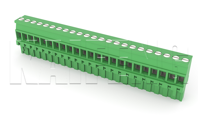 Pluggable Terminal Block MATERIAL:M2.5,Steel Zinc platedcontact: Phosphor bronzePin header: -Housing: PA66,UL94V-0ElectricalULIECRated voltage300V 320V Rated current15A10AContact resistance20mΩInsulation resistance500MΩ/DC500VWithstanding voltage AC2000V/1minWire range28-12AWG 2.5mm2MechanicalTemp.rang-40℃~+105℃ Max.soldering+250℃, 5s